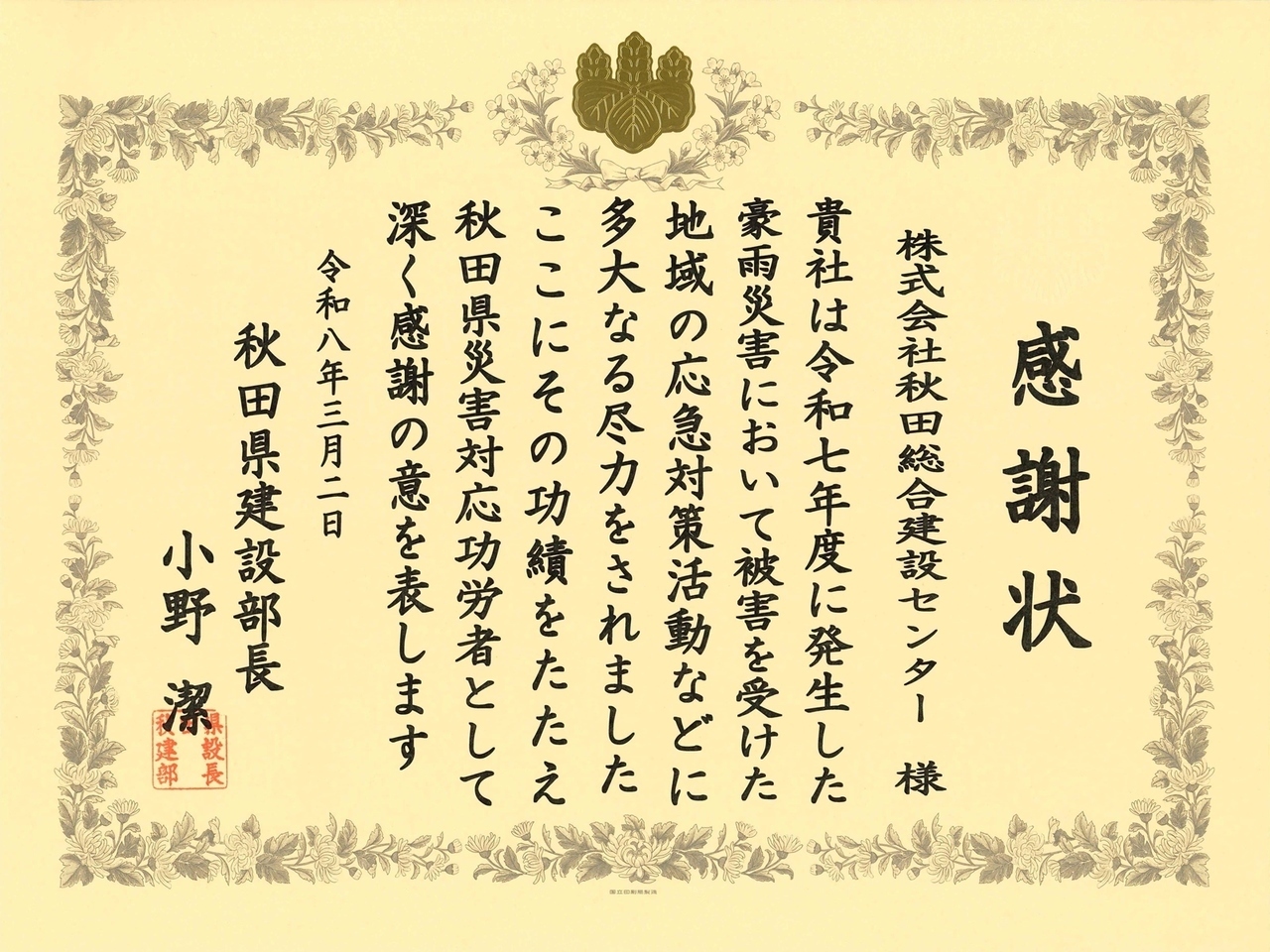 秋田県より、令和6年度の豪雨災害時に尽力した企業に、感謝状贈呈が行われました。当社では『秋田県災害対応功労者感謝状』をいただきました。地域に貢献出来たことに感謝し、これからも邁進してまいります。