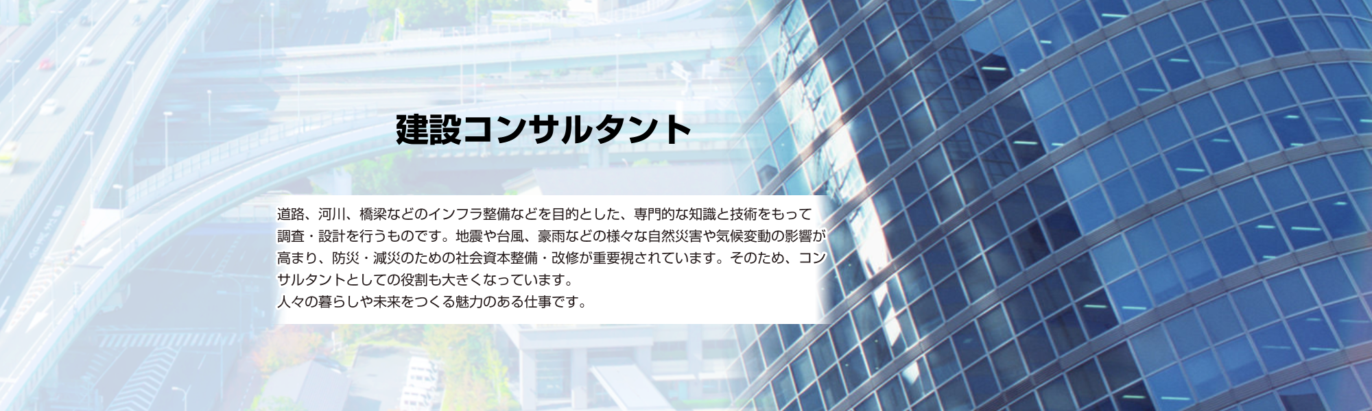 道路部門は、安全で快適な道路づくりを支える専門分野です。平面・縦断・横断の基本構造を検討し、走行しやすく安全な線形を計画します。歩道・自転車道・排水施設・法面など道路に必要な付帯施設も総合的に検討します。歩行者や車の安全性を確保します。渋滞・事故対策や老朽化対策にも取り組み、道路の長寿命化を推進。地域の暮らしと移動を良くするインフラ整備を支援します。
